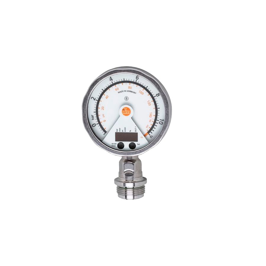 Indicador analógico, presostato y transmisor de presión en un equipo. Pantalla giratoria con barra de LED para indicar los puntos de conmutación. Robusta carcasa de acero inoxidable apta para aplicaciones asépticas que cumple los requisitos de la industria alimentaria y de bebidas. Conexión de proceso rasante para el uso en procesos CIP y SIP. Alimentación PNP/NPN. Rango de medición -14,5...145 psi (-1...10 bar). conexión de rosca G 1 rosca exterior Aseptoflex Vario. Conector: 1 x M12; codificación: A; Contactos: dorado