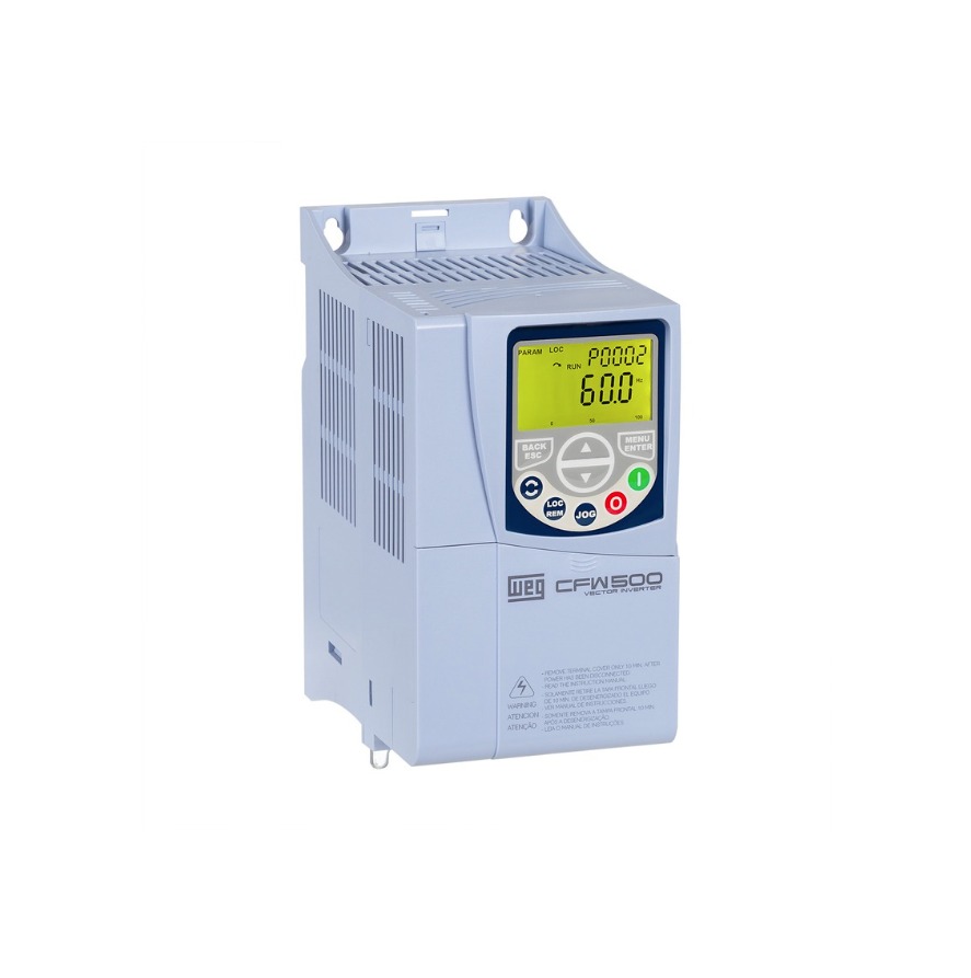Variador de Frecuencia WEG 7.5HP 10A 380/480VAC. Trifásico. El convertidor de frecuencia CFW500 es un accionamiento de velocidad variable de alta performance, que auxilia en el control de velocidad y del torque en motores de inducción trifásicos. El equipo cuenta con control vectorial sensorless, vectorial con Encoder o escalar y control de motores de imanes permanentes, SoftPLC, que agrega funciones de CLP (Controlador Lógico Programable), Funciones de Seguridad STO y SS1, Pump Genius, que trae funciones dedicadas para bombeo y módulos plug-in seleccionables, que proporcionan una solución flexible y optimizada para cualquier aplicación. // Grado de protección IP20; Estándar con frenado reostático